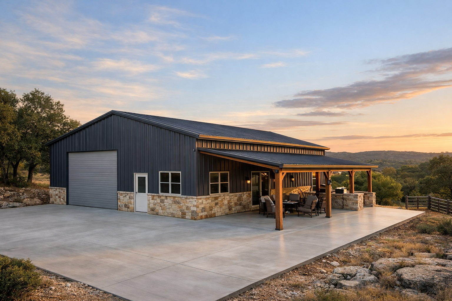 This project features a clean, functional metal building designed for both storage and everyday use, set on a large reinforced concrete slab. The structure combines durability with a more finished look, incorporating a stone base and warm wood accents to fit naturally into the Hill Country landscape.