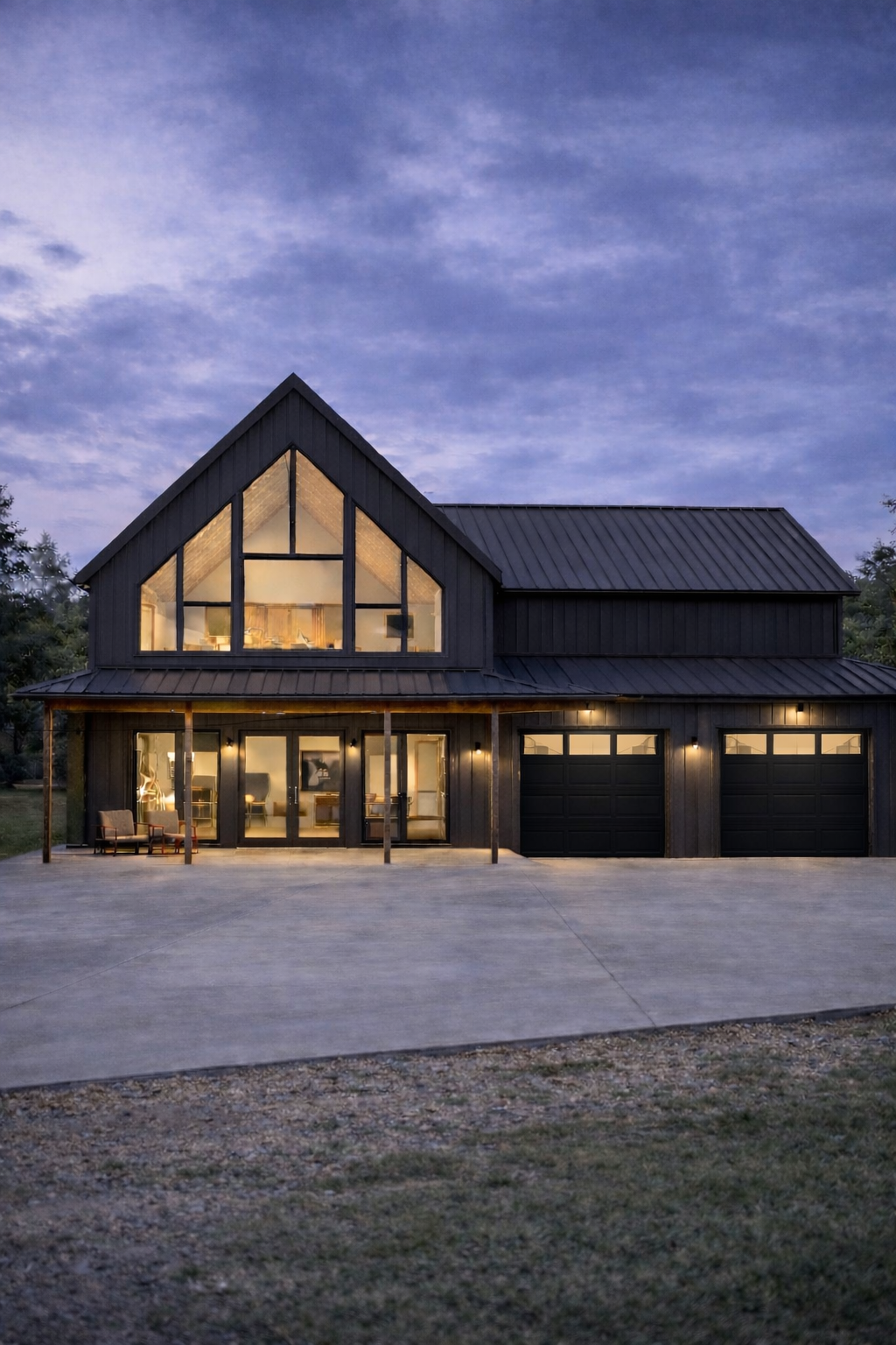 Built on a large concrete foundation, the structure combines durable metal construction with warm, intentional design details for a clean, finished look. An integrated garage and extended driveway provide practical space for vehicles, storage, and work use, while the covered front porch offers a comfortable outdoor area to relax and take in the property.